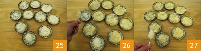 Once you have finished all the tartlets 25, lightly sprinkle them with breadcrumbs 26 and grated Parmesan cheese 27.