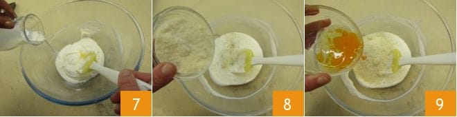 and loosen it with a little cream 7. Then add the grated Parmesan cheese 8, the slightly beaten egg 9 and mix everything together.