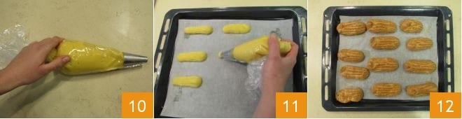 you can transfer it to a piping bag with a 12mm serrated nozzle 10. Form 12 éclairs, about 4-5 inches long, on a baking sheet lined with parchment paper 11, making sure to space them apart. Bake the éclairs in a static oven, preheated to 430°F, for 15 minutes. Then lower to 355°F and continue for another 15-20 minutes leaving the valve open. Once ready, let them cool completely 12.