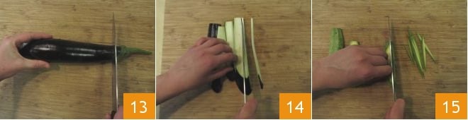 In the meantime, take care of the vegetables: wash and dry them thoroughly, then remove the ends from zucchini and eggplants 13. Cut them into sticks as thin as possible (14-15).