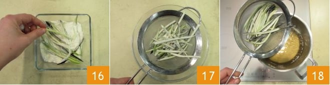 Pat dry with paper towels and then coat the sticks in flour 16. Shake off the excess flour using a sieve 17 and then fry in hot oil at 355°F for a couple of minutes 18.