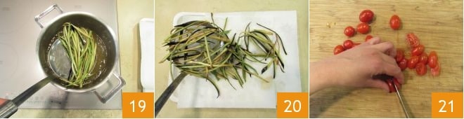 or until they are golden and crispy 19, drain on paper towels 20. Move on to the tomatoes, cut them in half 21
