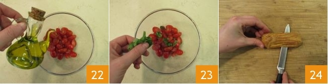 and place them in a bowl garnishing with salt, pepper, oil 22, and hand-torn basil leaves 23, mix and move on to the garnish. Cut the éclairs in half 24
