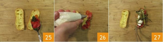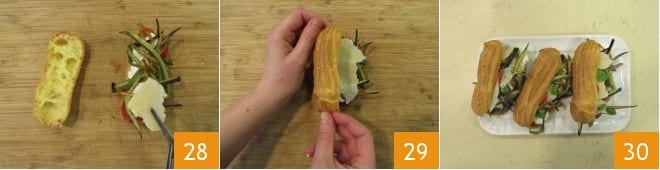 fill them with the cherry tomatoes, placing them on one side only 25, the ricotta placed in a piping bag with a 0.59-inch plain nozzle 26, and then the crispy vegetables salted just before filling the éclairs 27.