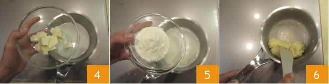 and then butter 4. Once it reaches a boil, add the flour at once 5. Stir the roux well with a spatula. Work for 2-3 minutes or until a white film forms at the bottom of the pan and the mixture pulls away from the sides 6.