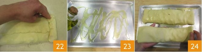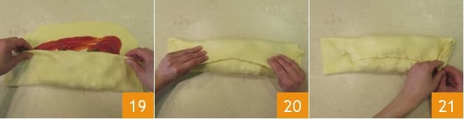 fold it again in the same direction 19 and then fold the top edge over the dough 20. Seal the outer edges by folding them inward 21