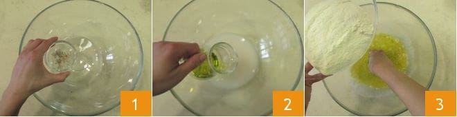 To make the scaccia, first prepare the dough: in a bowl, place the crumbled yeast 1, pour in the water, and stir to dissolve the yeast, then add the oil 2 and finally the flour, incorporating it gradually while mixing by hand 3.