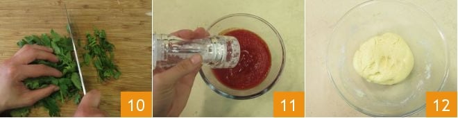 and finally chop the parsley 10. In a bowl, pour the tomato sauce 11 and season it with oil, salt 11, and pepper. Take your dough ball 12