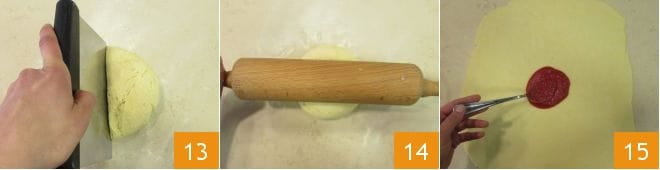 and divide it into two equal parts with a dough scraper 13. Take one half and roll it out with a rolling pin on a lightly floured work surface 14: you should obtain a thin sheet, 1 mm thick and approximately 15.75x14.57 inches. Fill the sheet with half of the tomato sauce 15, making sure to leave a border around the perimeter;