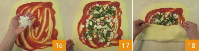 continue by adding half of the sliced onion 16, half of the chopped parsley 17, and half of the cheese. At this point, fold the sheet by lifting the edges from the shorter side 18,