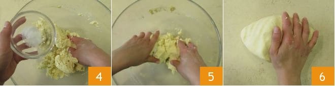 Once the flour has absorbed the liquid, add the salt 4. Knead again to combine 5 and then move to a work surface to form a homogeneous dough ball 6