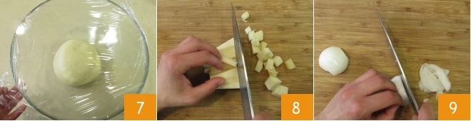 Place it in a bowl and cover with plastic wrap 7. Let it rest for an hour at room temperature (during the summer, 40 minutes of rest will suffice). Meanwhile, prepare the filling: dice the caciocavallo cheese 8, clean and thinly slice the onion 9,