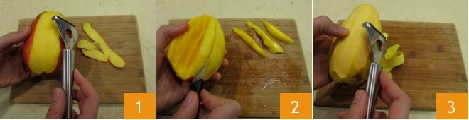 To prepare the scallops with fruit salad, start with the latter: peel the mango 1, then cut into slices by slicing until reaching the harder part 2. Then squeeze the central part by hand into a small bowl to collect the mango juice and set aside: you will use it for the sauce. Proceed to peel the papaya 3