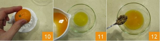 Next, prepare the fruit sauce: squeeze the juice from 2 mandarins 10, pour it into the bowl where you collected the mango juice 11, and add the grainy mustard 12.