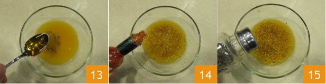 Add the honey 13 and flavor with a few drops of Tabasco 14. Then lightly salt and pepper 15;