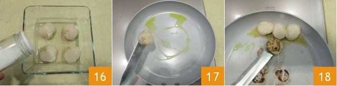 Then remove the scallops from the shells, taking only the white part (with the coral part of the scallops you could make an excellent risotto!); lightly salt 16 and pepper, then heat a pan with a little extra virgin olive oil and sear the scallops for about 4 minutes, turning them halfway through cooking (17-18). Once ready, you can transfer them to a paper towel.