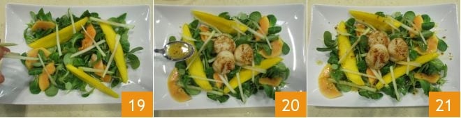 Now you can compose the serving plates: lay a bed of lamb's lettuce, place the mango slices, papaya, and well-drained apple sticks 19, then place the scallops and drizzle with the mango and mandarin sauce 20; your scallops with fruit salad are ready to enjoy 21!