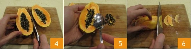 cut it in half 4 and remove the inner seeds with a spoon 5. Then cut into thin slices 6 and set aside.