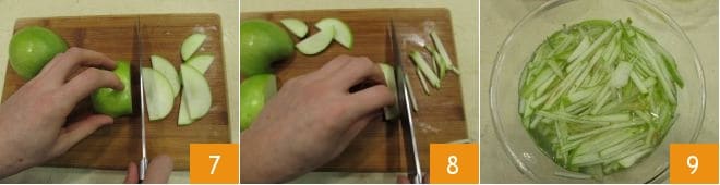 Cut the apple in half without peeling it, remove the core, and slice 7 before cutting into sticks 8. Then plunge them into cold water acidulated with lemon juice to prevent browning 9.