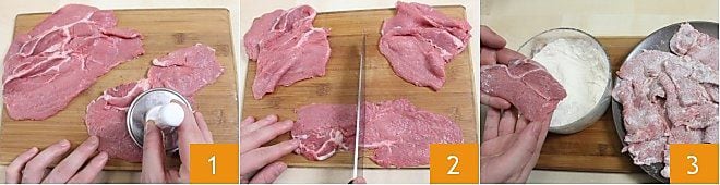 To prepare the pink scaloppine, the meat must be of excellent quality and very tender. First, take a cutting board, lay the slices on it and then flatten them with a meat tenderizer 1, if the slices are very large cut them in half to obtain regular portions 2. Flour the slices on both sides 3. Meanwhile, heat the oil and butter in a non-stick pan.
