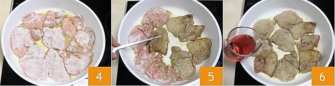 When the oil is hot, place the scaloppine in the pan and let them brown on both sides for a couple of minutes, until they are golden brown (4-5). Add the wine and let it evaporate 6.