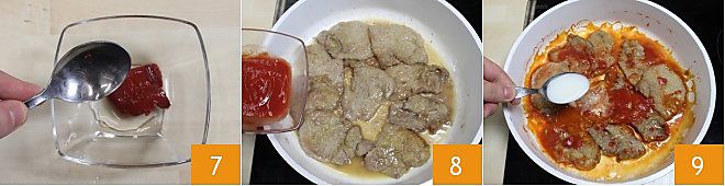 Meanwhile, dilute the tomato paste with some water or hot broth 7. When the wine has evaporated, add the tomato 8 and season with salt and pepper, according to your taste. When the tomato is well blended, add a few tablespoons of milk to dilute the cooking base 9.
