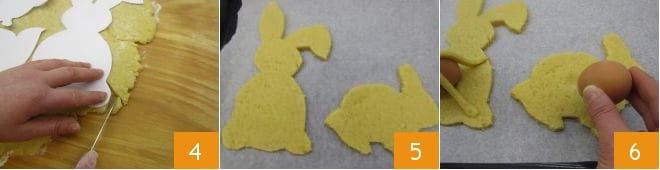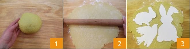 If you prefer to create other shapes, after letting the scarcelle dough rest 1, use a rolling pin to roll it out on a lightly floured surface until you get a thickness of about 0.31 inches 2, then place the templates of the Easter subjects you have chosen 3
