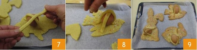 and using a small knife, cut the shortcrust pastry following the outline 4. Carefully transfer your shapes to a baking sheet lined with parchment paper 5 and place the boiled egg in the largest part 6.