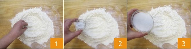 To prepare the Pugliese scarcelle, start with the dough: pour the flour onto a work surface 1, add the baking powder for sweets 2 and granulated sugar 3.
