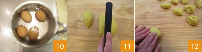 In the meantime, prepare the hard-boiled eggs: place the eggs in a saucepan, cover with cold water, and let them cook for 9 minutes from boiling 10, then cool them under running water and set aside without peeling. Once the Pugliese scarcelle dough has rested, divide it with a dough scraper 11 into 12 portions of about 75 g each. At this point, using your fingertips 12, shape each piece into a log