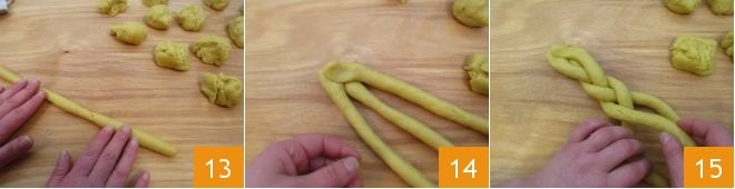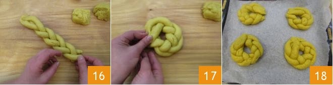 Once you have a single braid 16, join the two ends to give the Pugliese scarcelle a circular shape, like a donut 17. Proceed in the same way for the remaining pieces to make 4 scarcelle. Place them on a baking sheet 18