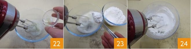 At this point, start preparing the glaze: pour the egg whites into a bowl and start whisking them with a mixer while pouring in the lemon juice 22. Once you have a frothy mixture, start adding the powdered sugar little by little 24 to achieve a very creamy consistency 24.