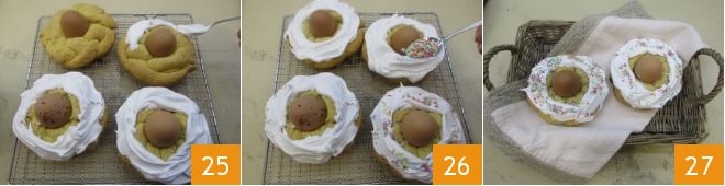 Cover the scarcelle with the freshly prepared glaze 25 and decorate with colored sprinkles 26. Let the glaze dry and serve your Pugliese scarcelle 27.