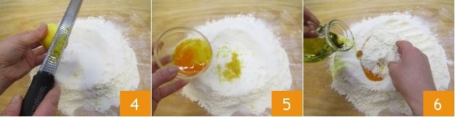 Aromatize with the grated lemon zest 4 (keep the lemon aside for the glaze later), add the slightly beaten egg 5, and start kneading with your hands while gradually pouring in the oil 6.