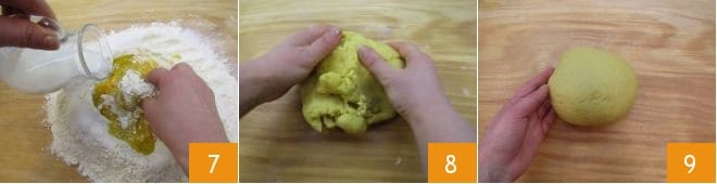 and then the milk 7. Once you have a smooth and elastic mixture 8, shape it into a sphere 9, cover with a kitchen towel, and let it rest for 30 minutes at room temperature.