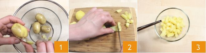To prepare the flatbreads with Asiago potato salad, start by cooking the potatoes in a pressure cooker for 10 minutes. Once cooked, drain them with a colander and peel them 1, then place them on a cutting board and cut them in half. Then cut them into small cubes 2, transfer them into a bowl and season with extra virgin olive oil 3.