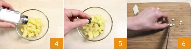 Salt and pepper the potato salad to taste 4 and also add some chopped parsley 5. Now place the Asiago cheese on the cutting board and after forming sticks, cut into cubes 6.