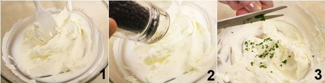 To prepare the flatbreads with bresaola rolls, start by making the cream: place the robiola cheese in a bowl and mix it until creamy 1, add salt, pepper 2, and chopped chives using scissors 3. Mix well to blend everything together and put the cream in a piping bag.