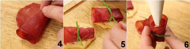 Meanwhile, prepare the rolls: roll up the slices of bresaola to form small cones 4, then tie the cones with chive strands 5. Take the piping bag with the cream and fill the rolls 6. Place one roll on each flatbread and serve.