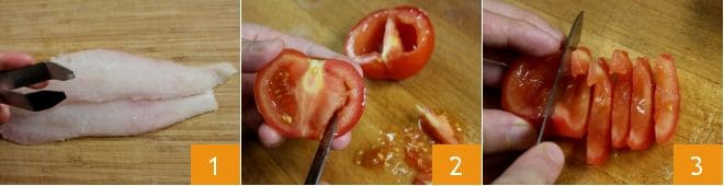 To prepare the sea bream fillets in a cage, start by cleaning the sea bream (you can also ask your trusted fishmonger to fillet the sea bream for you to skip this step): for detailed instructions, consult the cooking school sheet: How to clean the sea bream. Scale the fish with a knife, then cut off all the fins and make an incision to gut it; then rinse it thoroughly under running water. Cut off the head, then make an incision along the back of the sea bream and with the knife blade cut along the bone and detach all the meat, repeating the operation on the opposite side; then remove the skin from the fillets. Once you have the fillets, check that they don't have bones by running your fingers over the surface: if you find any, you can easily remove them with kitchen tweezers 1. Now move on to the seasoning: wash the tomatoes, cut them in half and scoop them out to remove the seeds 2; cut them into strips 3 and then into cubes.