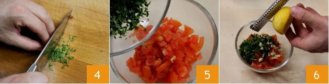 Chop the aromatic herbs 4: thyme, dill, marjoram, and parsley; also chop a clove of garlic. Place the diced tomato pulp in a small bowl, then add the chopped herbs 5, the garlic, the grated lemon zest, 6 a drizzle of oil, salt, and pepper to taste.