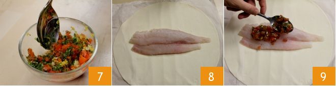 Mix everything with a spoon 7 and assemble the sea bream in a cage: take the ready-made puff pastry and unroll it, leaving the baking paper it wraps with. Place the two sea bream fillets in the center slightly overlapping 8, season them with a little fine salt and the tomato filling 9.