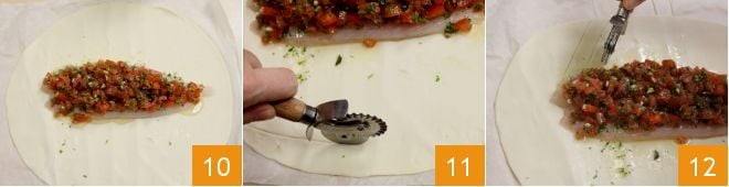 Once the ingredients are finished 10, start preparing the cage (if the puff pastry seems too much, you can trim it by creating a narrower oval around the fillets 11. Then start preparing the cage: with a smooth pastry cutter create diamonds in the central part of the pastry about an inch wide 12, starting from the edges towards the fillets, leaving the two ends intact at the mouth and tail.