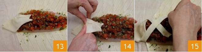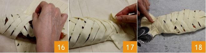 Fold the pastry at one of the two ends towards the inside: it will be the mouth of the fish 13, then cut a piece and set it aside 14. Then create the cage by interweaving the puff pastry strips over the fillets 15,