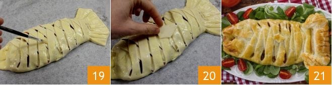 leaving more or less space between one and the other depending on the desire to show the filling 16, then fold the final part of the tail: fold the puff pastry laterally into two triangles and then fold everything towards the inside 17 and make incisions with the smooth-edged pastry cutter (they will simulate the fins) 18.