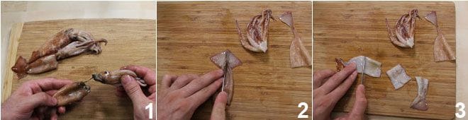 To prepare the sea skewers, start by cleaning the small squid: remove the tentacles and set them aside 1, empty the sac of the innards and clean it well. Open the sac of the small squid with a central cut 2 and cut it into rectangular pieces 3.
