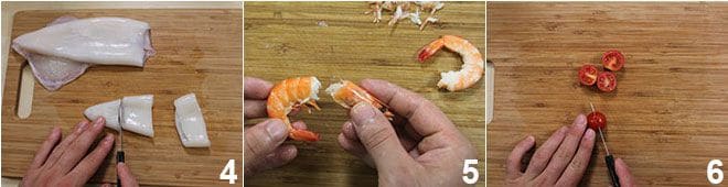 If you have whole squid, clean them following the procedure you can How to Clean Squid (Squid Cleaning). Cut the squid into strips 0.5-1 inch wide 4 and clean the shrimp by removing the head, the shell, and leaving the tail 5. With a small knife, cut the back of each shrimp to remove the black vein inside. Cut the cherry tomatoes in half 6.