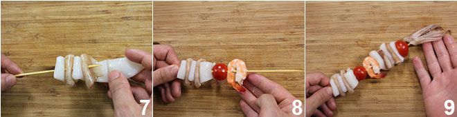 Now assemble the skewers: take a strip of squid, skewer it with a skewer and alternate its folds with the small squid rectangles 7. Now continue with half a cherry tomato and a shrimp 8, again with a series of squid and small squid and finish with another half tomato and a tentacle of small squid 9. Continue like this for the other 7 skewers.