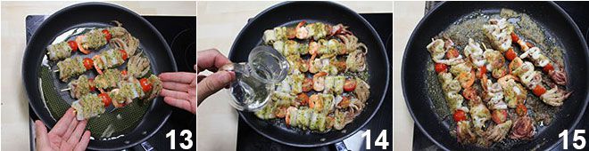 Cook the skewers in a pan with 2 tablespoons of extra virgin olive oil 13 over high heat for 5-6 minutes. Halfway through cooking, moisten with white wine 14 and turn the skewers, continue cooking for another 5 minutes and your sea skewers will be ready!