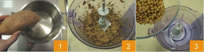 To prepare the seitan burgers, first boil the sweet potatoes for about 25 minutes 1. Meanwhile, prepare the burgers: place the seitan in a mixer and blend it coarsely 2; then set it aside. Place the chickpeas in the mixer glass 3